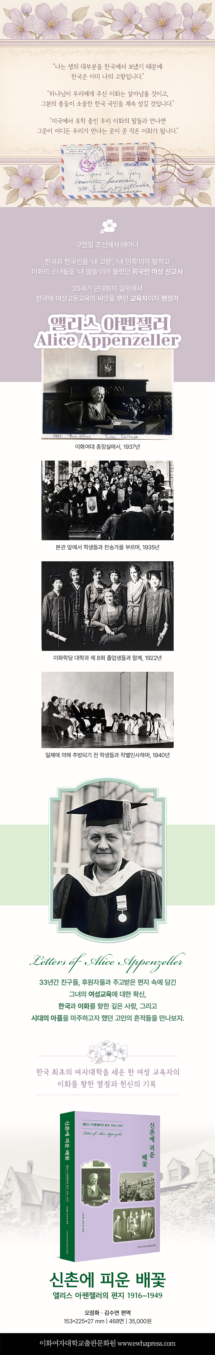 이 책은 앨리스 아펜젤러가 이화학당 교사로 부임한 다음 해인 1916년부터 생을 마칠 때까지 주고받은 편지, 전보, 각종 기록들을 담고 있다. 그녀가 이화와 함께한 시간들을 크게, 선교사로 파송되어 와 이화학당 교사로 일한 시기(1916~1922년), 학당의 당장이 되어 교육행정을 시작한 시기(1923~1925년), 학당 대학과를 분리ㆍ독립시켜 전문학교Ewha College로 인가받기 위한 행정 절차들을 진행한 시기(1925~1932년), 신촌으로 이화여전을 이전해 새 캠퍼스를 일군 시기(1935~1940년), 선교사 철수 후 미국에서 한국 복귀를 기약하며 교육 사역을 이어간 시기(1940~1946년), 해방 후 한국으로 돌아와 이화여자대학교로서의 새로운 도약을 준비한 시기(1947~1949년)의 여섯 시기로 나누어 조명한다. 한국과 한국인을 ‘내 고향’, ‘내 민족’이라 부르고, 이화의 소녀들을 ‘내 딸들’이라 칭했던 아펜젤러의 글에는 한국과 이화를 향한 깊은 사랑, 여성교육에 대한 확신, 그리고 시대의 고통을 정면으로 마주하려는 치열한 고민의 흔적들이 담겨 있다. 일제의 철수 명령으로 미국에 머무는 동안에도 여러 기관과 후원자들에게 한국을 향한 관심과 지원을 요청하며, 귀국한 뒤에는 여성들의 학업이 분단과 전쟁으로 중단되지 않도록 도와달라고 호소했던 앨리스 아펜젤러. 이 책을 통해 평생을 바쳐 이화와 한국을 위해 기도하고, 작은 희망이라도 나누고자 쉼 없이 타자기를 두드렸을 그녀의 신념과 열정이 고스란히 담긴 기록들을 만날 수 있을 것이다.